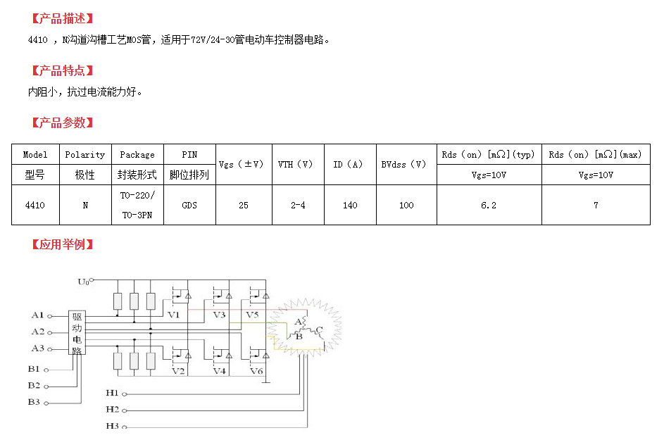 在140A、100V的大電流、低壓MOS管型中,140a100v場效應(yīng)管推薦這一款純國產(chǎn)的4410型號來應(yīng)用于電源逆變器和同步整流電路。