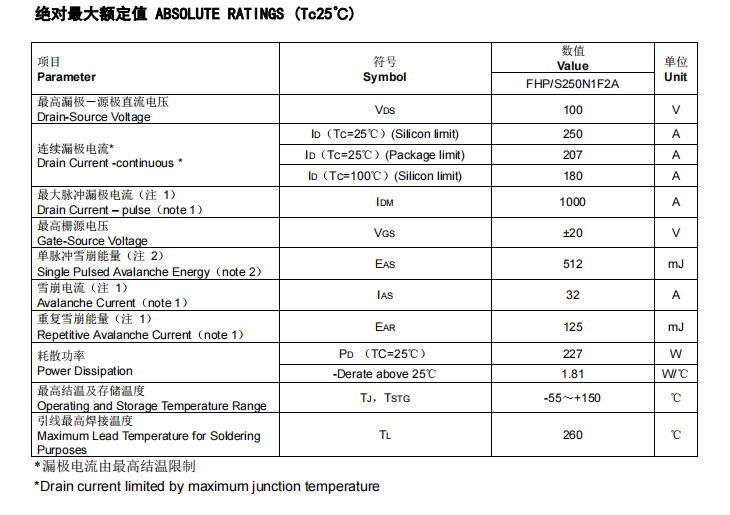當然,在應用中,工頻逆變器MOS管,代換IPP030N10N3G我們逆變器研發工程師一定要了解這款優質FHP250N1F2A國產場效應管的詳細參數:其具有250A、100V的電流、電壓, RDS(on) = 3.0mΩ(MAX) @VGS = 10 V,RDS(on) = 2.5mΩ(TYP) @VGS = 10 V,最高柵源電壓@VGS =±20 V。